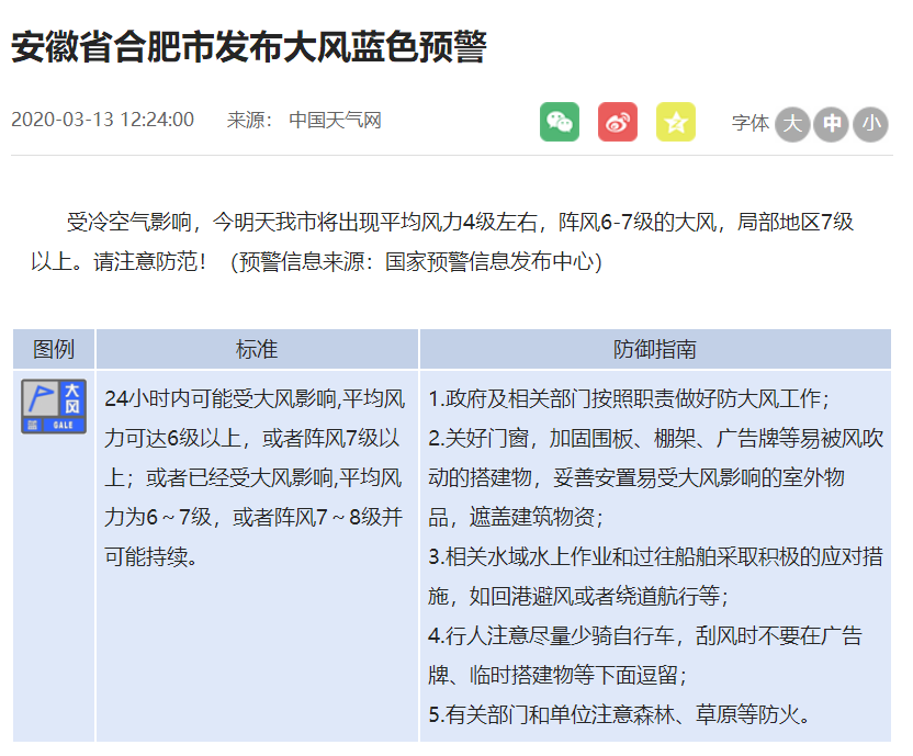 24小時(shí)內(nèi)可能受大風(fēng)影響,平均風(fēng)力可達(dá)6級以上,或者陣風(fēng)7級以上;或者已經(jīng)受大風(fēng)影響,平均風(fēng)力為6~7級,或者陣風(fēng)7~8級并可能持續(xù)。
